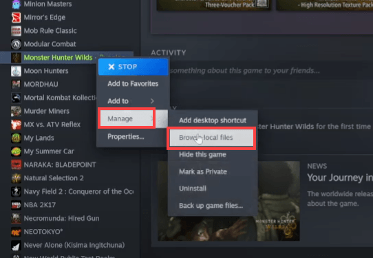 - In your LIBRARY, right-click on your game and select Manage > Browse local files.