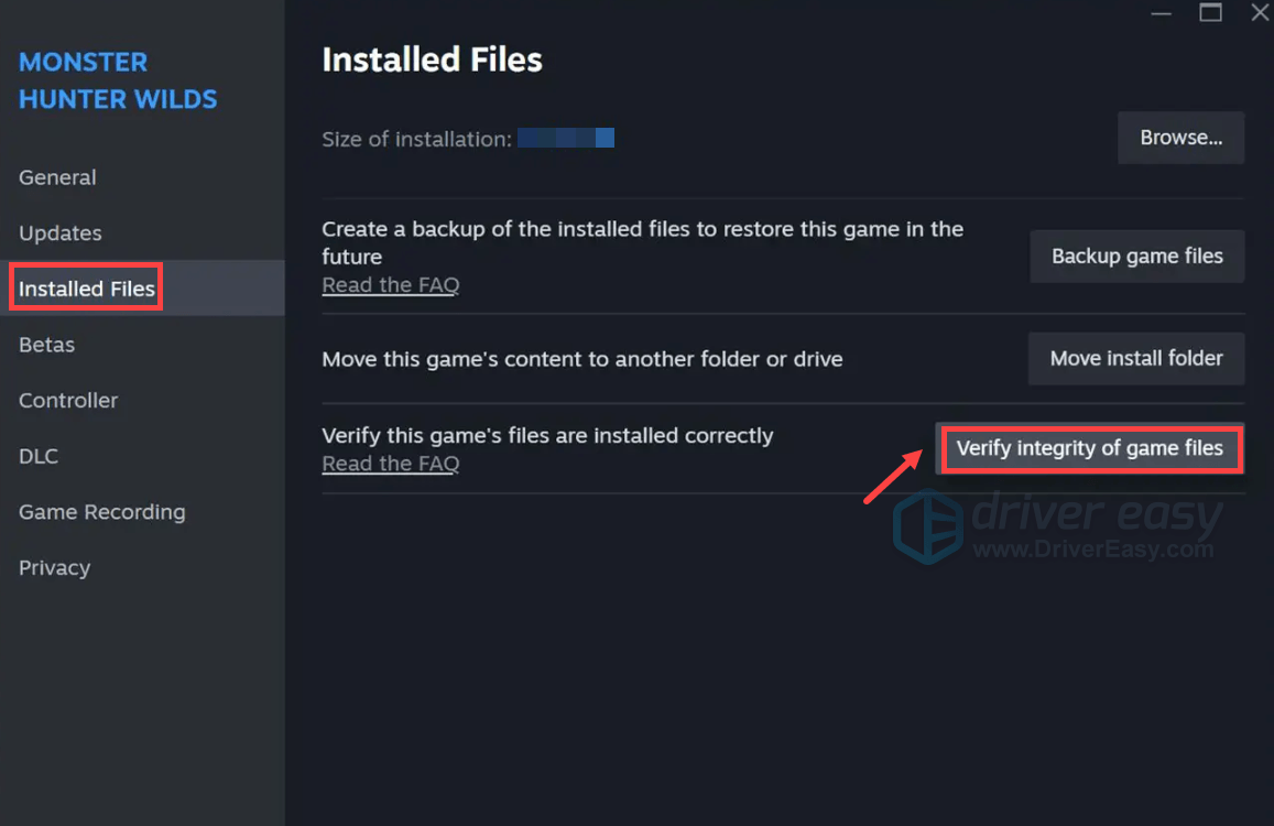 - Select the Installed Files tab and click the Verify integrity of game fiels button.