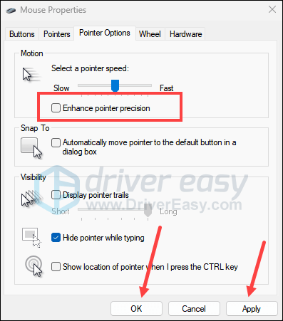 - Untick the box for Enhance pointer precision, then click Apply and OK.