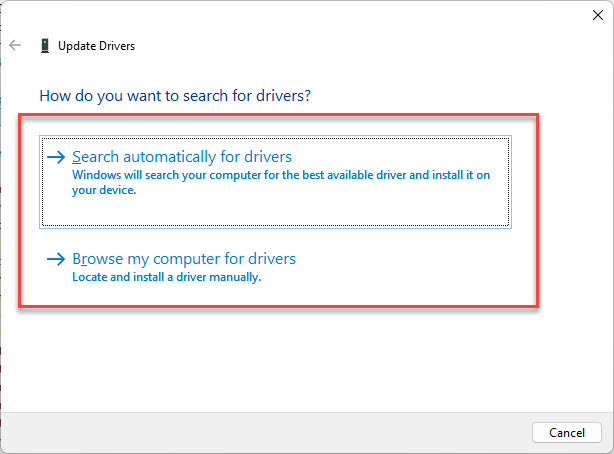 - You’ll be prompted with two options. Click on Search automatically for updated driver software. Windows will search online for the latest driver version and install it for you if an update is found.