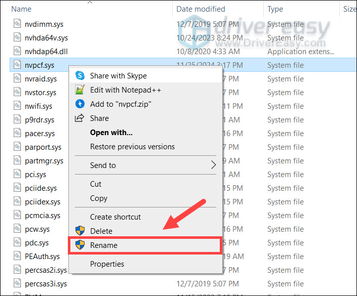 - Find and right click the nvpcf.sys file, then select Rename. Change the name to nvpcf.sys.old and restart your PC.