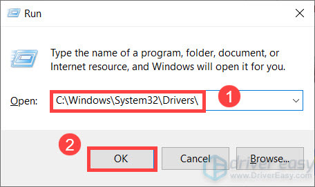 - On your keyboard, press Win+R to invoke the Run box. In the input box, enter or paste C:\Windows\System32\Drivers\ then click OK.