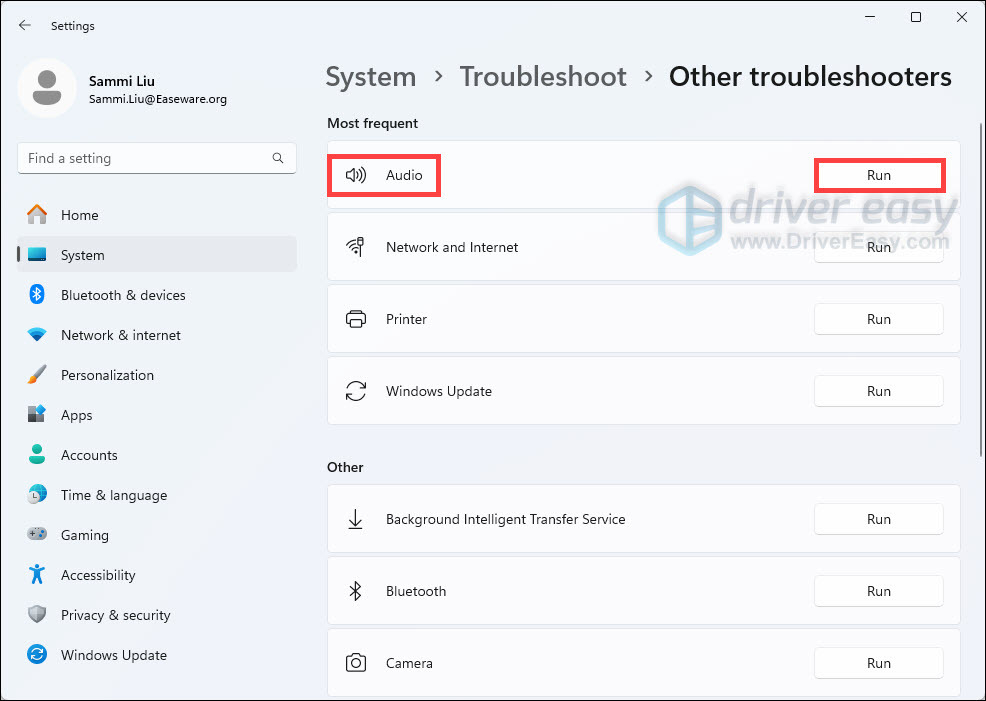 - Go to Audio section and click the Run button to start the audio troubleshooter.