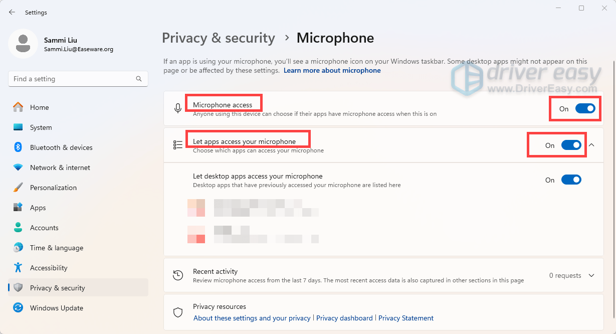 - Select Privacy & security from the left pane, then click Microphone under the App permissions section.