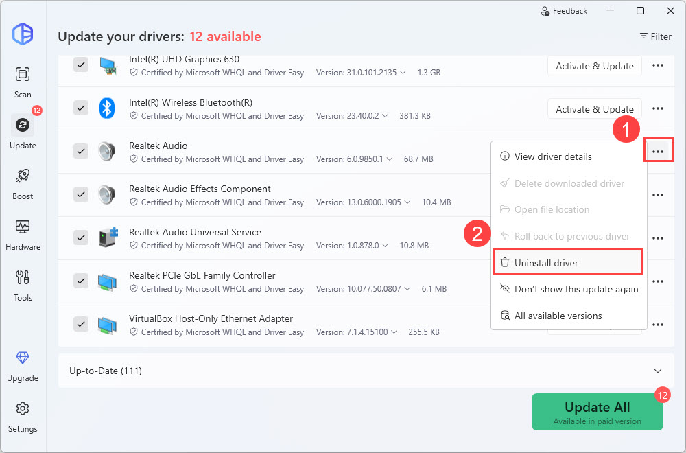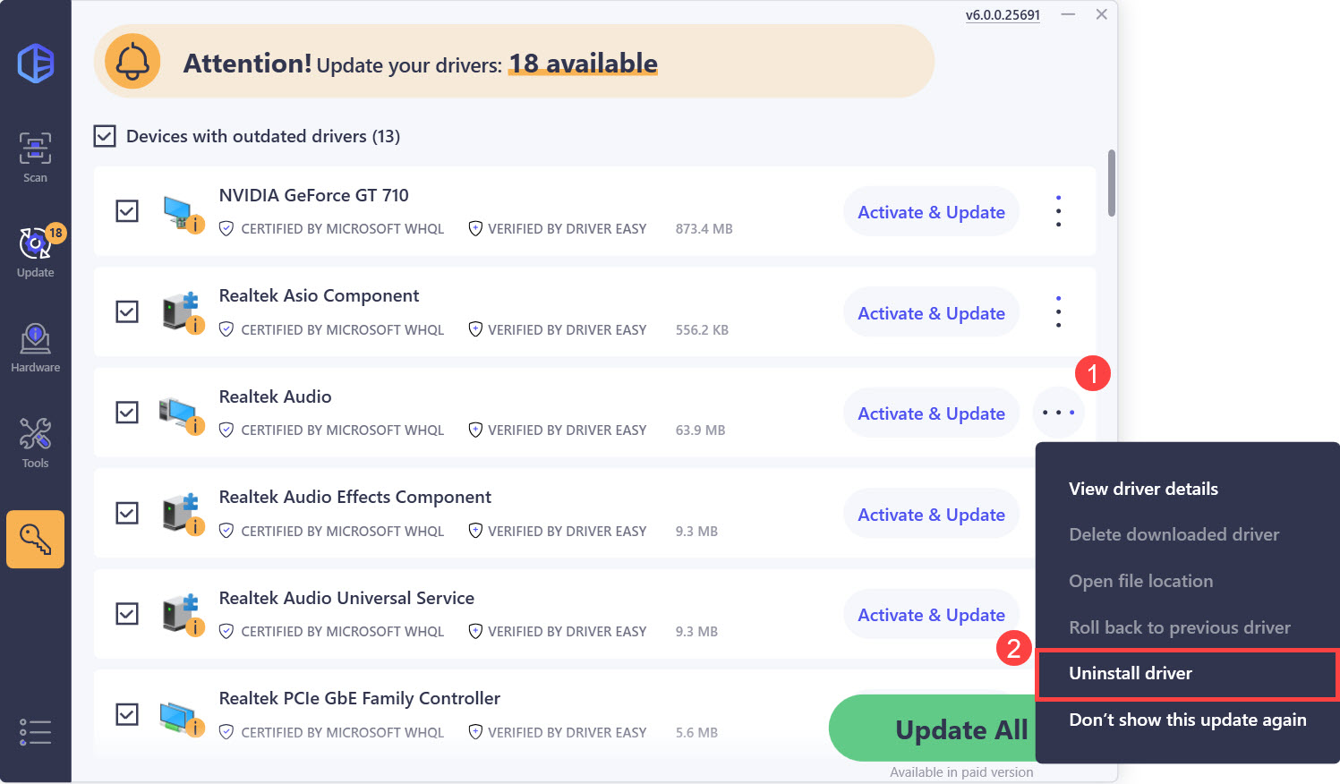 - Click the three dots icon next to an audio driver and select Uninstall driver (this requires the Pro version). Since replacing the old driver with a newer one may solve the audio issues, you can also choose to update all your drivers with one click to keep your PC drivers up-to-date.