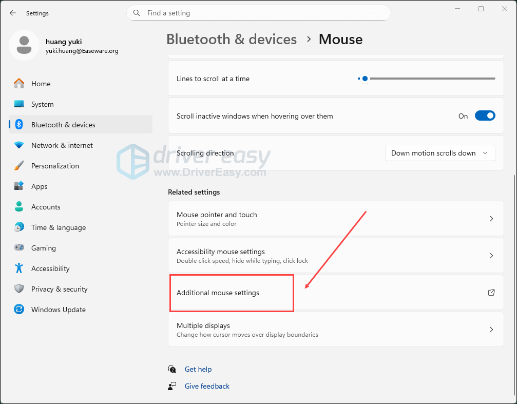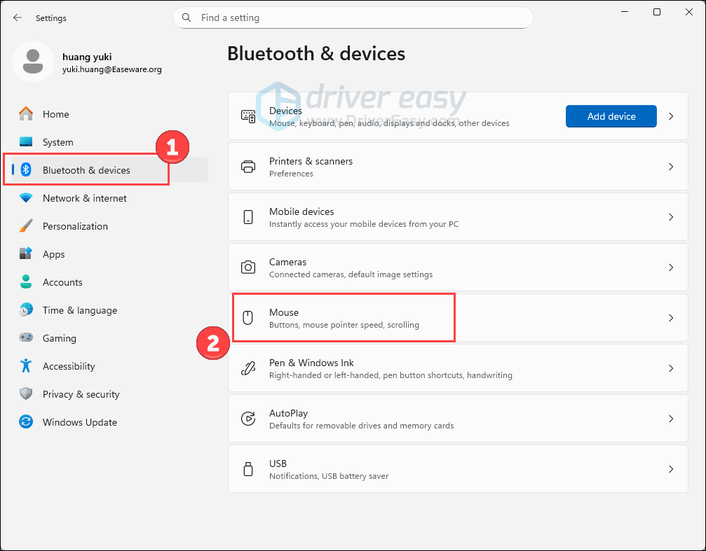 - Press the Windows logo key and I on the keyboard to invoke Settings. Select Bluetooth & devices on the left panel, and then click Mouse on the right.