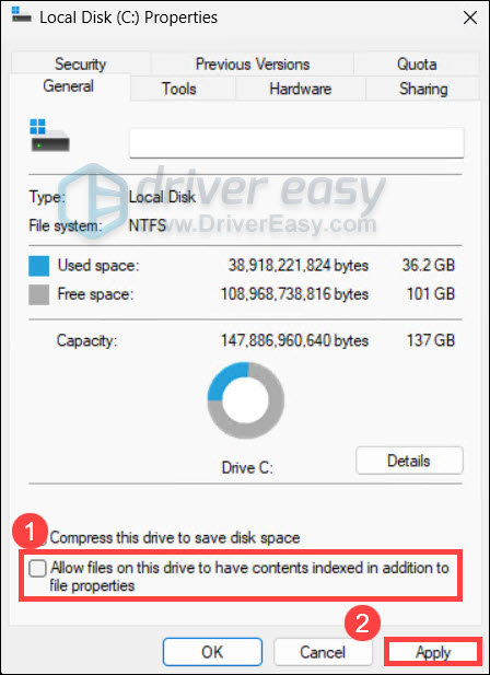 Uncheck the box next to Allow files on this drive to have contents indexed in addition to file properties. Click Apply.