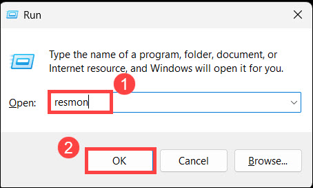- One your keyboard, press Win+R to invoke the Run box. Type or paste resmon and click OK. This will open Resource Monitor.