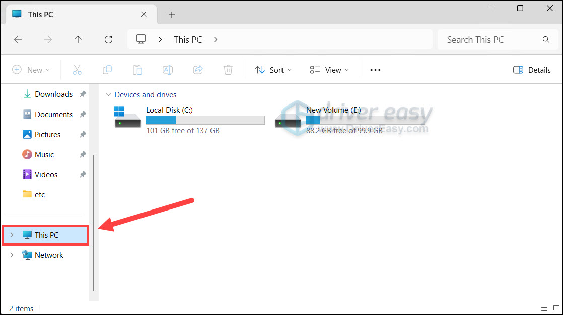 - On your keyboard, press Win+E to open File Explorer. In the left pane, click This PC.