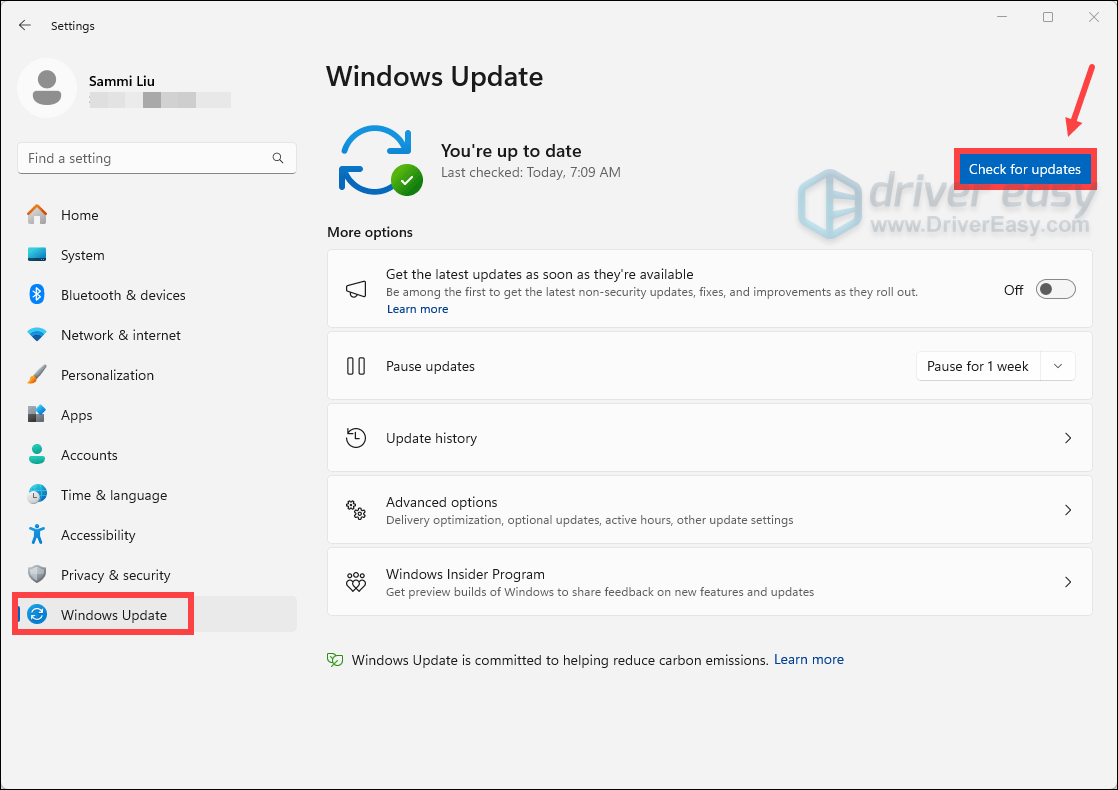 - In the Settings sidebar, select Windows Update. Click Check for updates.