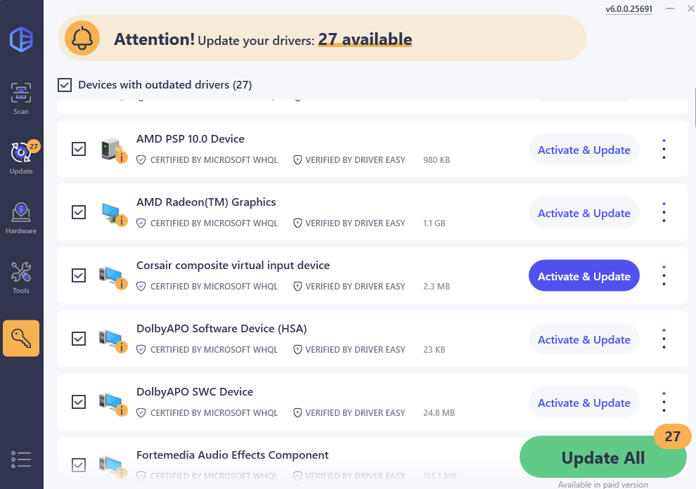 In most cases, updating drivers can have the same effect as reinstalling. You can update your drivers manually, by visiting the Corsair website, downloading the driver installer for your device and installing step by step. But if you’re not comfortable playing with device drivers, you can update automatically with Driver Easy.