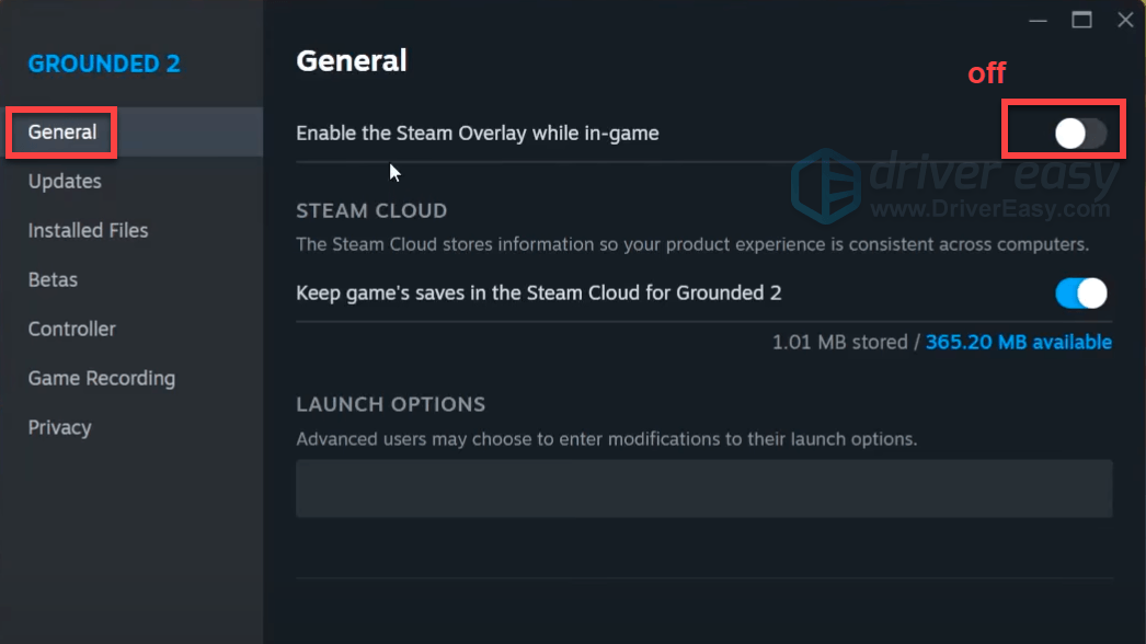 Go to your Steam LIBRARY, right-click on your game and select Properties. In the General tab, toggle off the option “Enable the Steam Overlay while in-game”.
