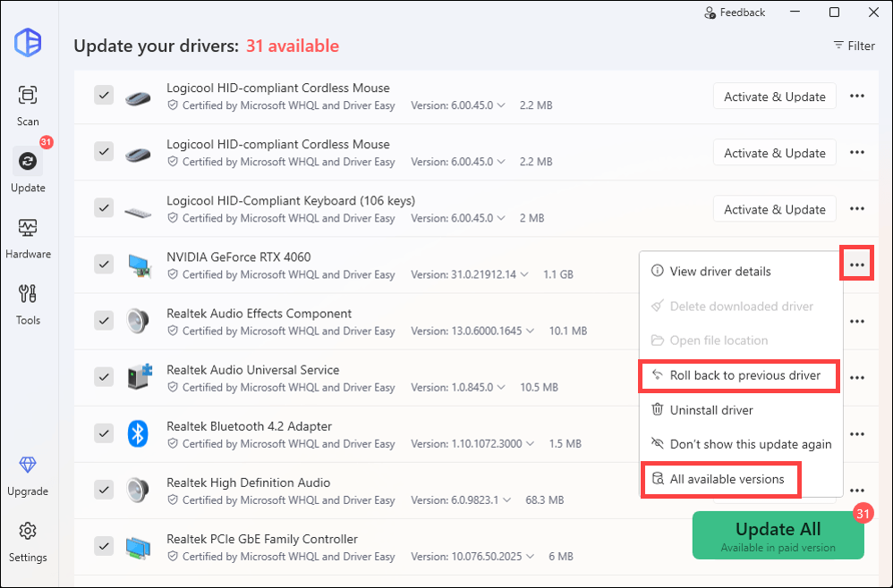 For a simplified process of getting driver updates, you can try Driver Easy, a handy driver updater tool that will automatically detect any missing or outdated drivers on your system, then download and install the latest versions corresponding with your system version. You can also choose the specific version you want to install or roll back to a previous one in case the latest one doesn’t work as expected. Moreover, it will automatically create a restore point, allowing you to go back to a previous state in case something unusual happens.