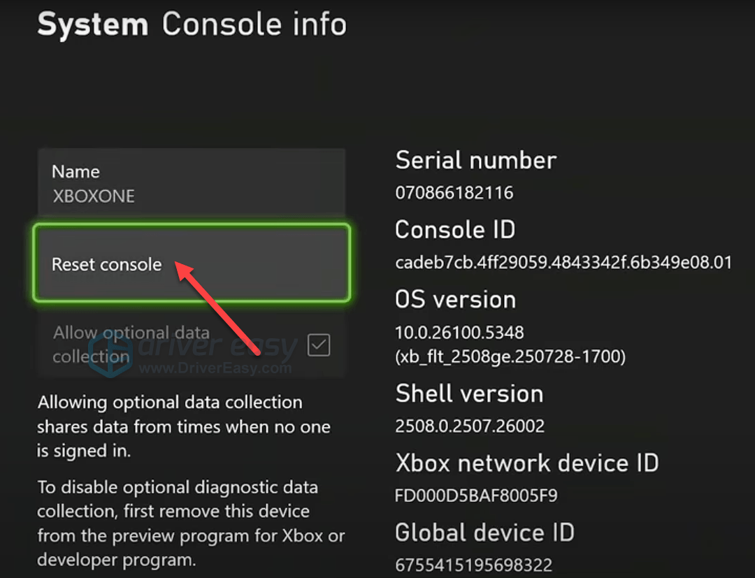 - Select Reset console.