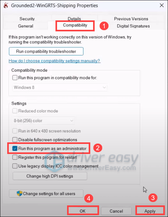 - Select the Compatability tab, check the box nex to Run this program as an administrator, then click Apply > OK.