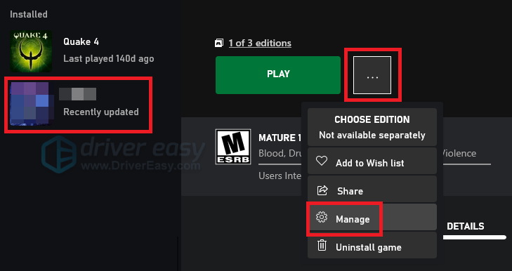 - Select the [⋯] button next to the PLAY button of your game title, then choose Manage.