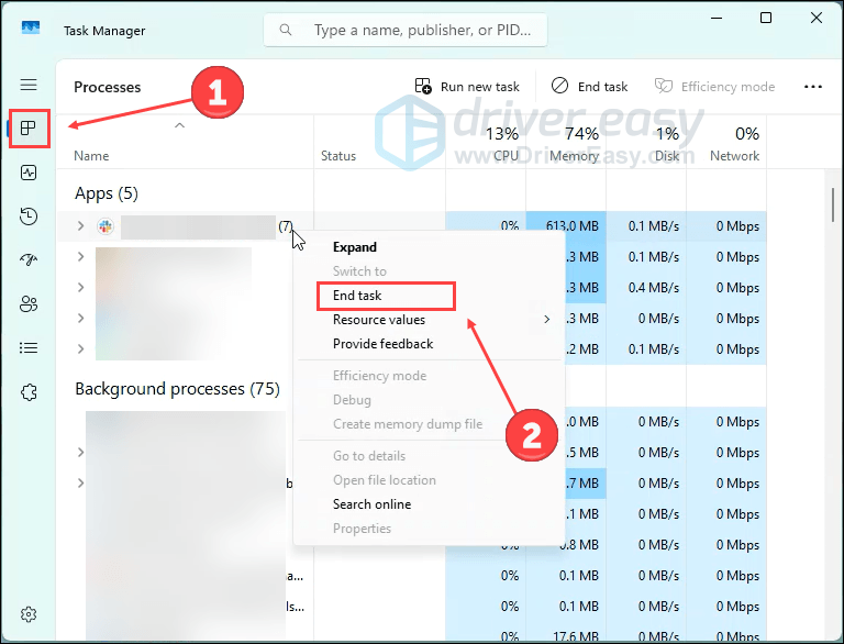 - Click Processes from the left panel. Right-click on the apps or background processes you want to close, and click End task.
