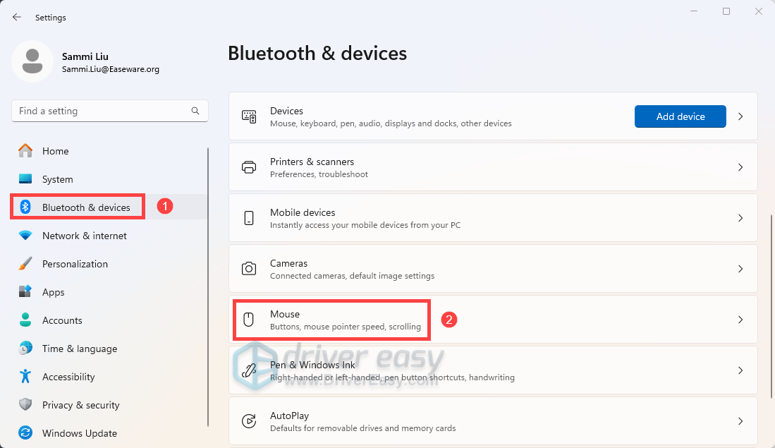 - Select Bluetooth and devices. Scroll down. Find the Mouse option and click on it.