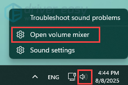 - Right-click the little speaker icon on the far right side of your taskbar, then click Open Volume mixer.
