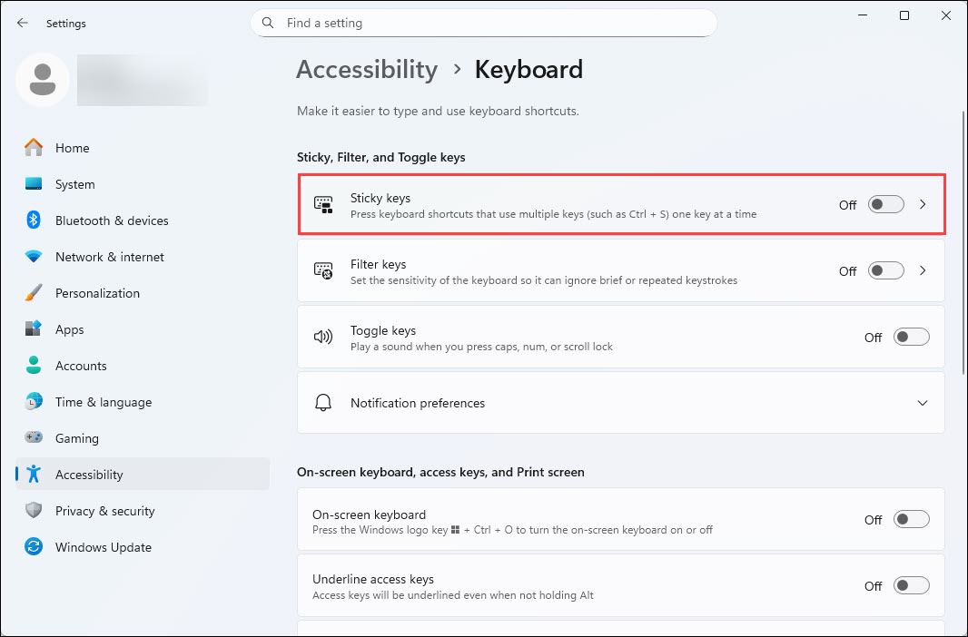 2) Click Keyboard on the left pane. Then check the icon of Sticky Keys. If it’s on, set it to be off.