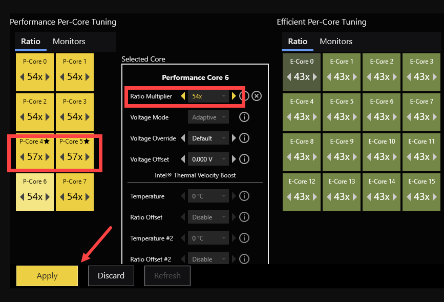 - Scroll down to Per Core Tuning, and change all Ratio Multipliers to 54x. Then click Apply.