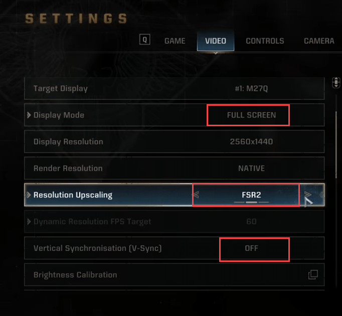 - Change the Display Mode to FULLSREEEN, Resolution Upscaling to FSR2, and V-Sync to OFF.