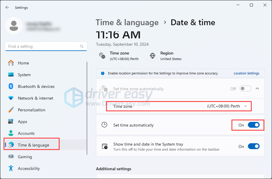 - Select Time & Language > Date and Time. Make sure that the Time zone is correct, and that the Set time automatically option is toggled to On.