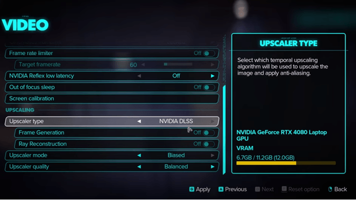 - Select NVIDIA DLSS for Upscaler type, and turn off both Frame Generation and Ray Reconstruction.