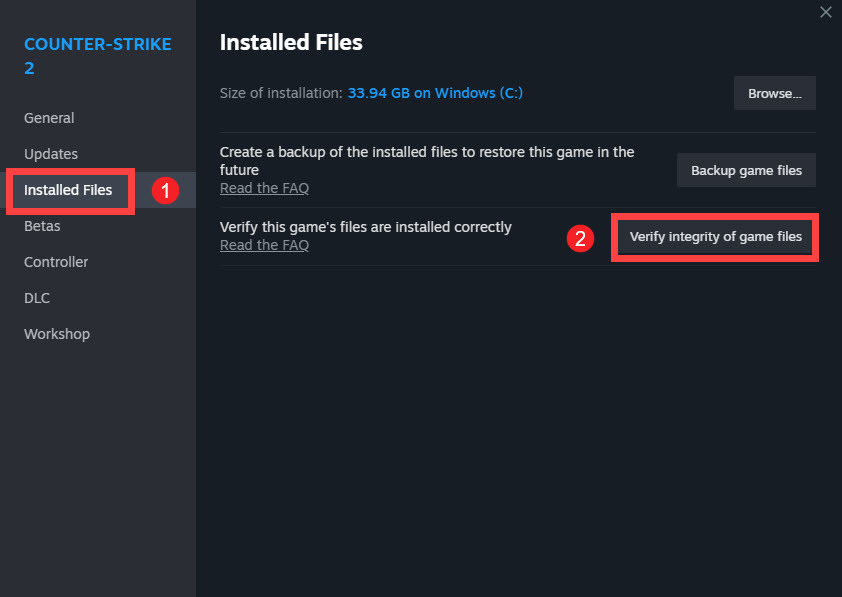 - Click the Installed Files tab, then click Verify integrity of game files. Wait for the process to be completed.