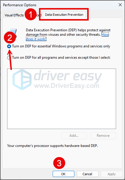 - Go to Data Execution Prevention, and select Turn on DEP for essential Windows programs and services only. Confirm with OK.