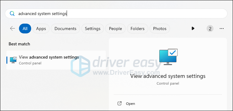 - On your keyboard, press the Windows key and type advanced system settings. Then select Advanced system settings.