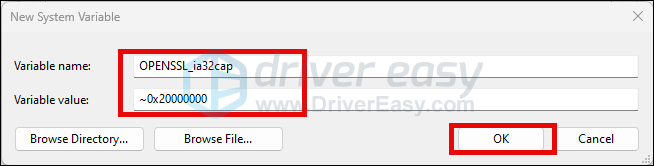 - Copy OPENSSL_ia32cap as the Variable name and ~0x20000000 as the Variable value. Then click OK to save.