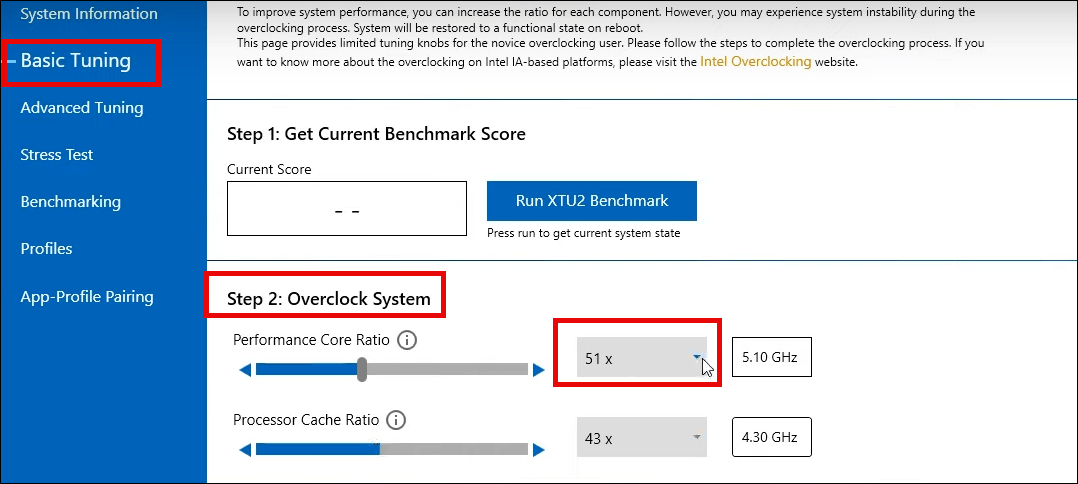 - Launch Intel XTU. Go to Basic Tuning > Overclock System > Performance Core Ratio. Change the value to a number that’s slightly smaller than the default. For instance, I have 52x, and I’ll change it to 51x.