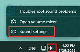 - Right-click on Speakers/Headphone icon at the bottom right of your taskbar. Then click Sound settings.