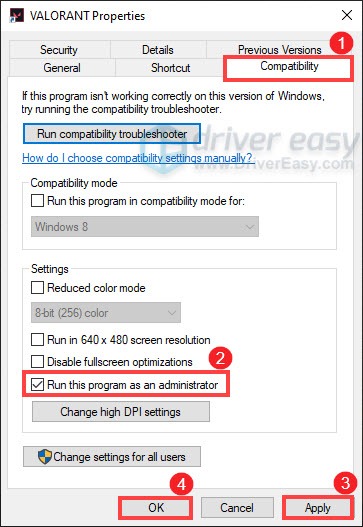 - Select the Compatibility tab. Check the box Run this program as an administrator. Then click Apply > OK.