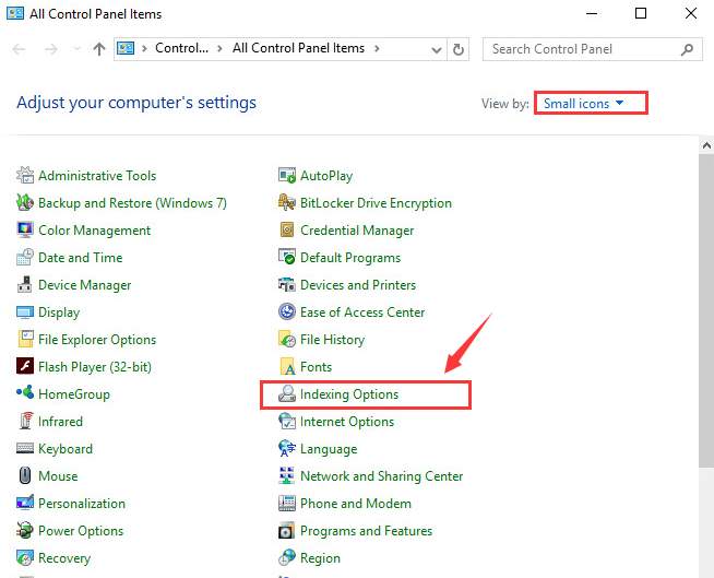 2) Select Indexing Options. (If you can’t find it, try changing your view to Small icons.)