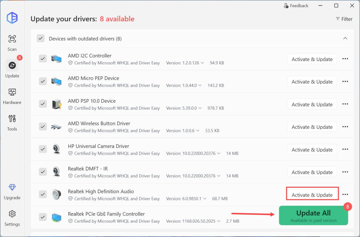 3) Click the Activate & Update button next to the flagged audio driver to automatically download and install the correct version of that driver.